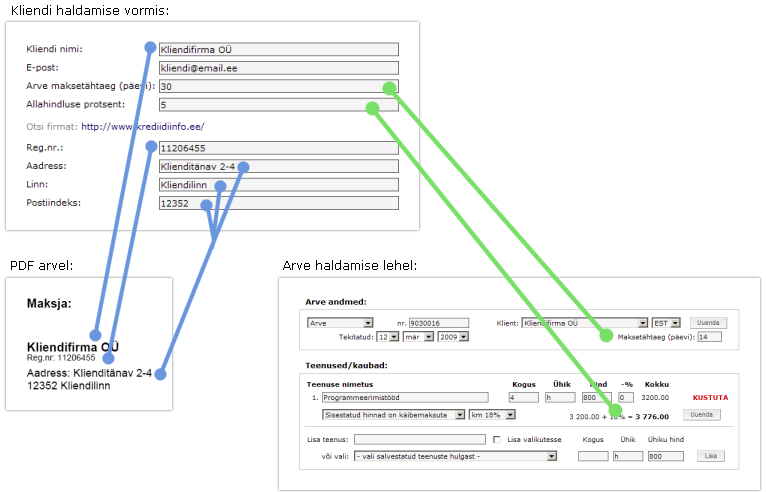 Kliendi haldamise lehel sisestatud andmed ilmuvad PDF arvele ning arve haldamise lehele.